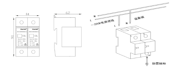 電源相線(xiàn)(L)、零線(xiàn)(N)分別接入電涌保護(hù)器相應(yīng)接線(xiàn)端子,保證牢固及可靠,將避雷器接地端與防雷地線(xiàn)(推薦接地電阻≤4Ω)作良好電氣連接。