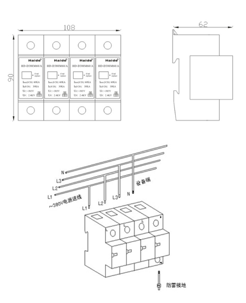 電源相線(L)、零線(N)分別接入電涌保護器相應(yīng)接線端子,保證牢固及可靠,將避雷器接地端與防雷地線(推薦接地電阻≤4Ω)作良好電氣連接。